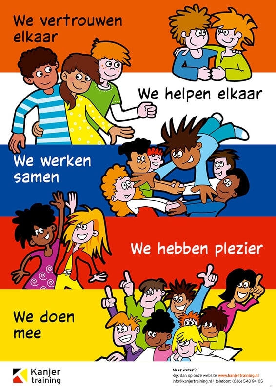Daarnaast gaat de Kanjertraining om groepsvorming. Als kinderen zich veilig voelen in een groep en elkaar kennen, komt vervelend (pest)gedrag aanzienlijk minder voor. Kanjertraining leert kinderen op een goede manier voor zichzelf op te komen en maakt ze bewust van wat hun gedrag bij anderen teweegbrengt. Dit doen we door wekelijkse lessen en oefeningen in de groepen 1 t/m 8.